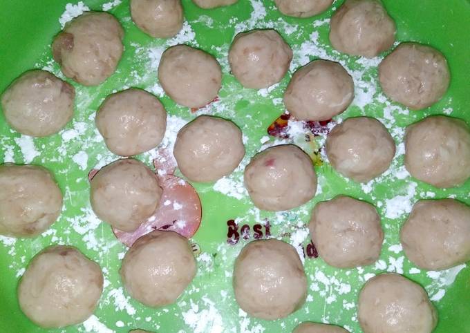 - Blender ayam hingga halus, campurkan tepung dan penyedap lalu bentuk bulat2.