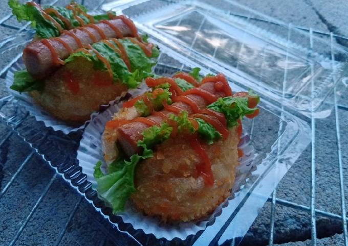 - Penyajian : ambil 1 buah donat, belah tengah menggunakan pisau, lalu isi dengan daun selada, sosis, terakhir beri saus dan mayonaise. Siap disajikan💕.
