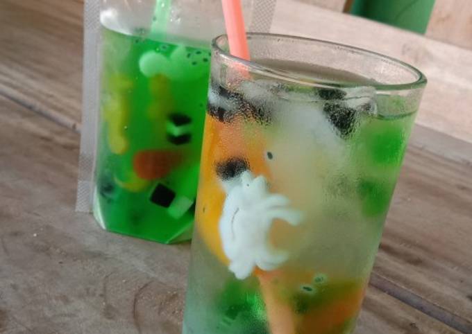 - Siapkan semua bahan isian dalam wadah atau gelas lalu masukan es batu, jeli, biji selasih, jeli kemasan, dan tuang kan sirup secukup nya.. tmbah air matang sedikit biar bisa tercampur rasanya cek rasa lalu siap dinikmati.