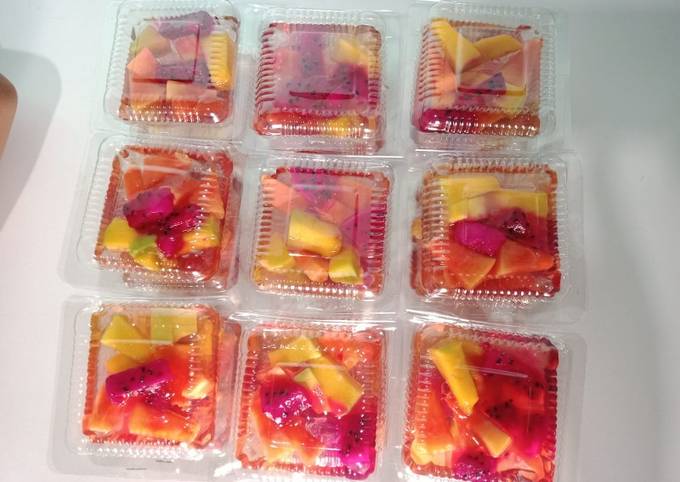 - Tata buah di mika kemudian siram dg nutrijel. tunggu dingin baru ditutup menggunakan staples simpan di kulkas spy lbh nikmat😀.