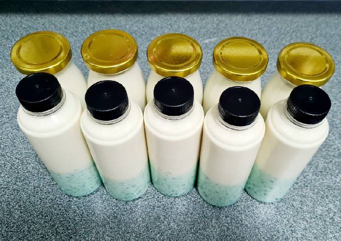 - Siapkan botol bersih, udah disteril. Masukkan jelly dan milk cheese ke botol, tutup rapat, simpan dikulkas. Siap jual mam. Tpi aku buat bukan utk dijual, utk diminum sendiri 😝.