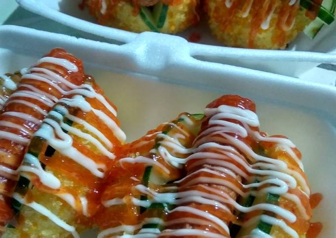 - Goreng dengan api kecil cenderung sedang. Goreng sekali balikan. Tunggu dingin dan belah tengah seperti hotdog. Isi dengan selada timun sosis. Kemudian beri mayonaise dan saos..